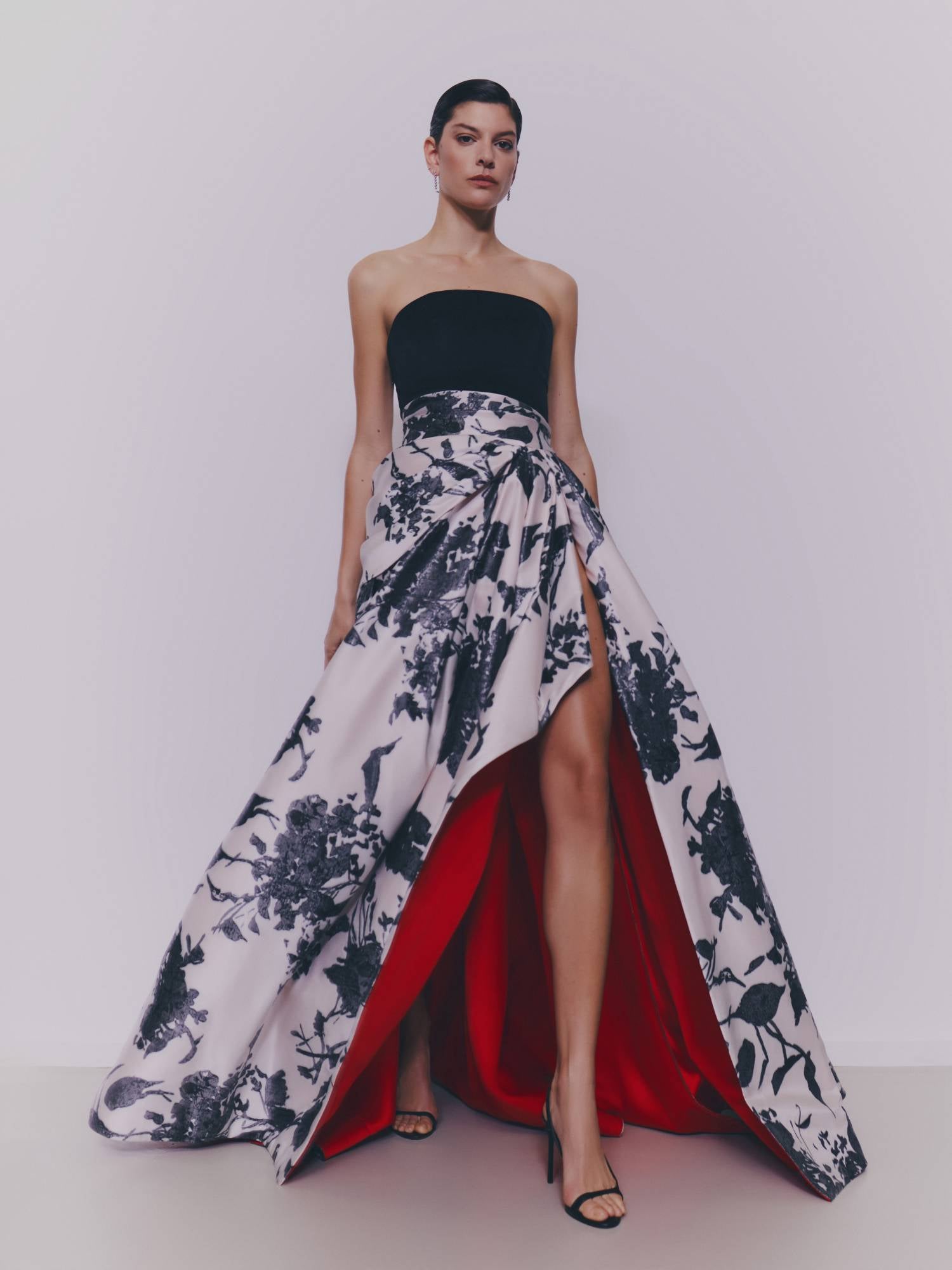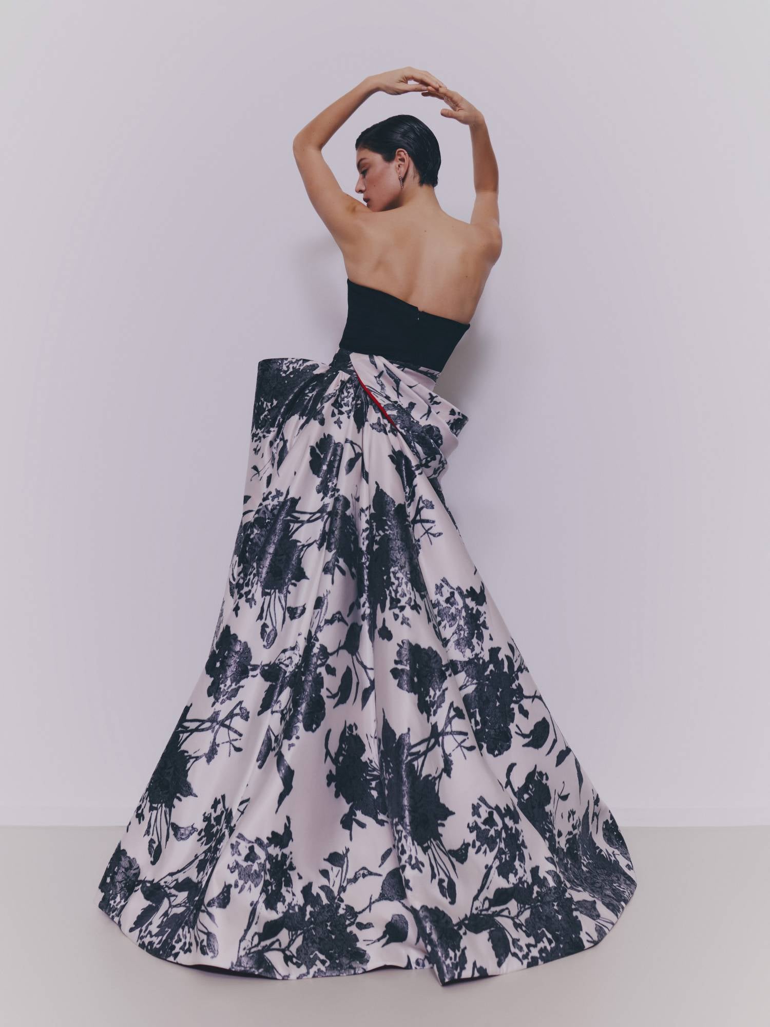 Un abito che incarna la perfetta fusione tra femminilità sofisticata e forza espressiva. Il corpino dal taglio pulito e senza spalline, valorizza la linea delle spalle e del décolleté con un’eleganza minimalista.