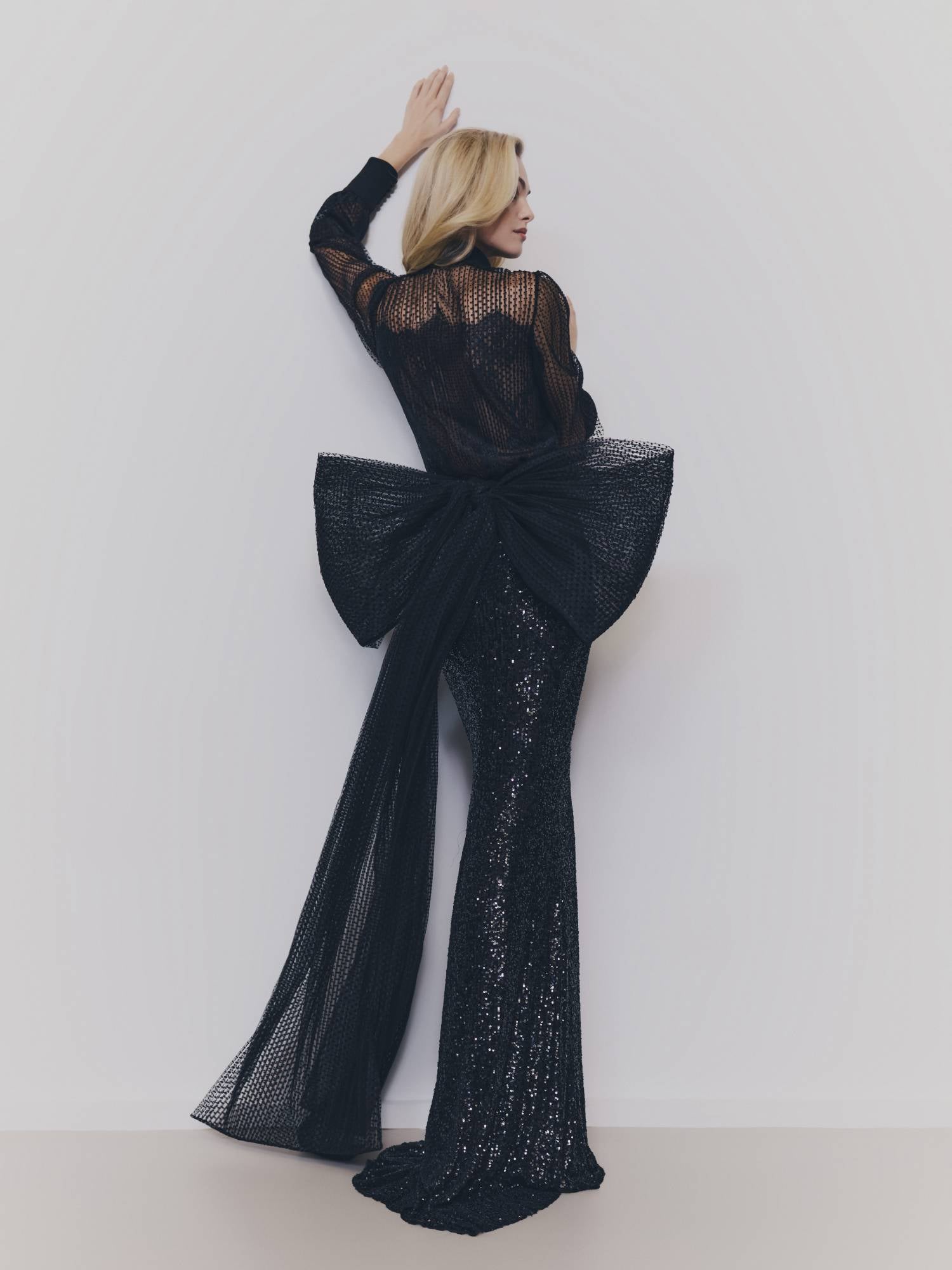 La parte superiore, realizzata in tulle ricamato effetto rete, presenta una camicia con colletto e bottoni gioiello, elegante e audace allo stesso tempo. La gonna lunga a sirena è interamente ricamata di paillettes, scolpendo la silhouette con una luce sofisticata. Sul retro, un ampio fiocco strutturato in tessuto tecnico crea un volume architettonico e una lunga coda che dona movimento e teatralità.