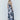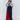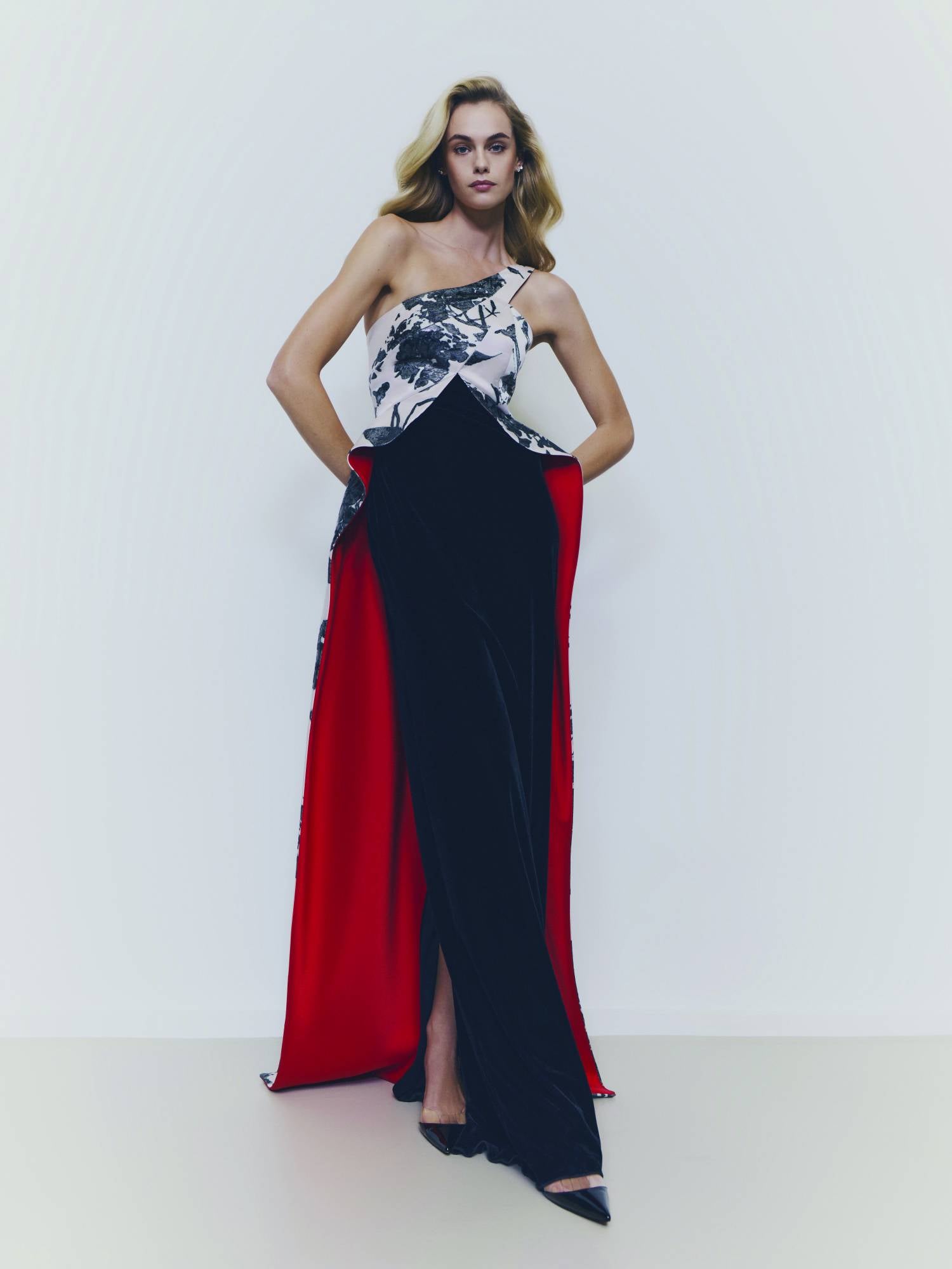 La parte superiore in tessuto floreale sui toni del nero e del bianco avvolge il busto con eleganza, mentre la gonna lunga scende morbida sulla figura, aprendosi sul davanti rivelando un sorprendente interno rosso intenso. Un dettaglio che illumina l’abito e ne sottolinea il carattere deciso e sofisticato.