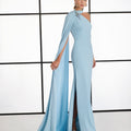 Realizzato in tessuto fluido di alta qualità, questo modello avvolge la figura con una linea aderente e una gonna lunga con spacco frontale, ideale per slanciare la figura e accompagnare il passo con naturalezza. Lo scollo mono spalla si fonde armoniosamente con il dettaglio del collo ad anello, per un equilibrio perfetto tra modernità e classicismo.